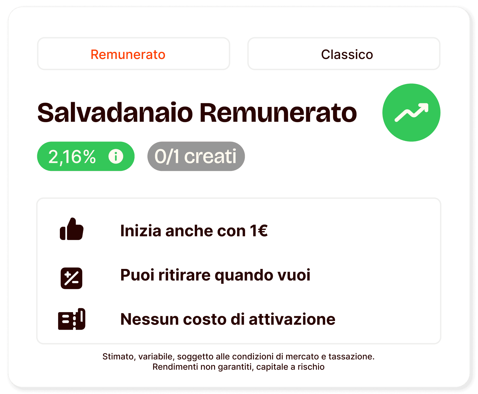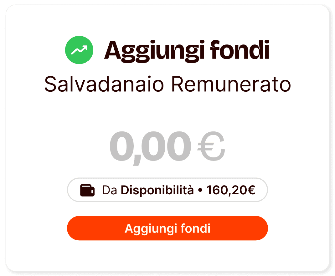 Questa è una comunicazione promozionale. Con il Salvadanaio Remunerato puoi investire in un fondo monetario che presenta un rischio molto basso. Tuttavia, il capitale non è garantito ed è soggetto al rischio di perdita. Il rendimento è variabile ed è influenzato dalle condizioni di mercato, compresi i rischi di tasso e di credito. Il rendimento annualizzato è una stima che si riferisce al rendimento medio ponderato dei titoli in cui investe il fondo monetario al netto dei costi del fondo. Gli scenari presentati sono una stima del rendimento futuro sulla base di prove relative alle variazioni passate del valore di questo investimento e/o sulla base delle condizioni attuali del mercato e non sono un indicatore esatto. Gli importi dei rimborsi varieranno a seconda della performance del mercato e del periodo di tempo per cui è mantenuto l’investimento. I rendimenti sono soggetti a tassazione, la quale dipende dalla situazione personale di ciascun investitore e può cambiare in futuro. Consulta la documentazione del fondo prima di investire.