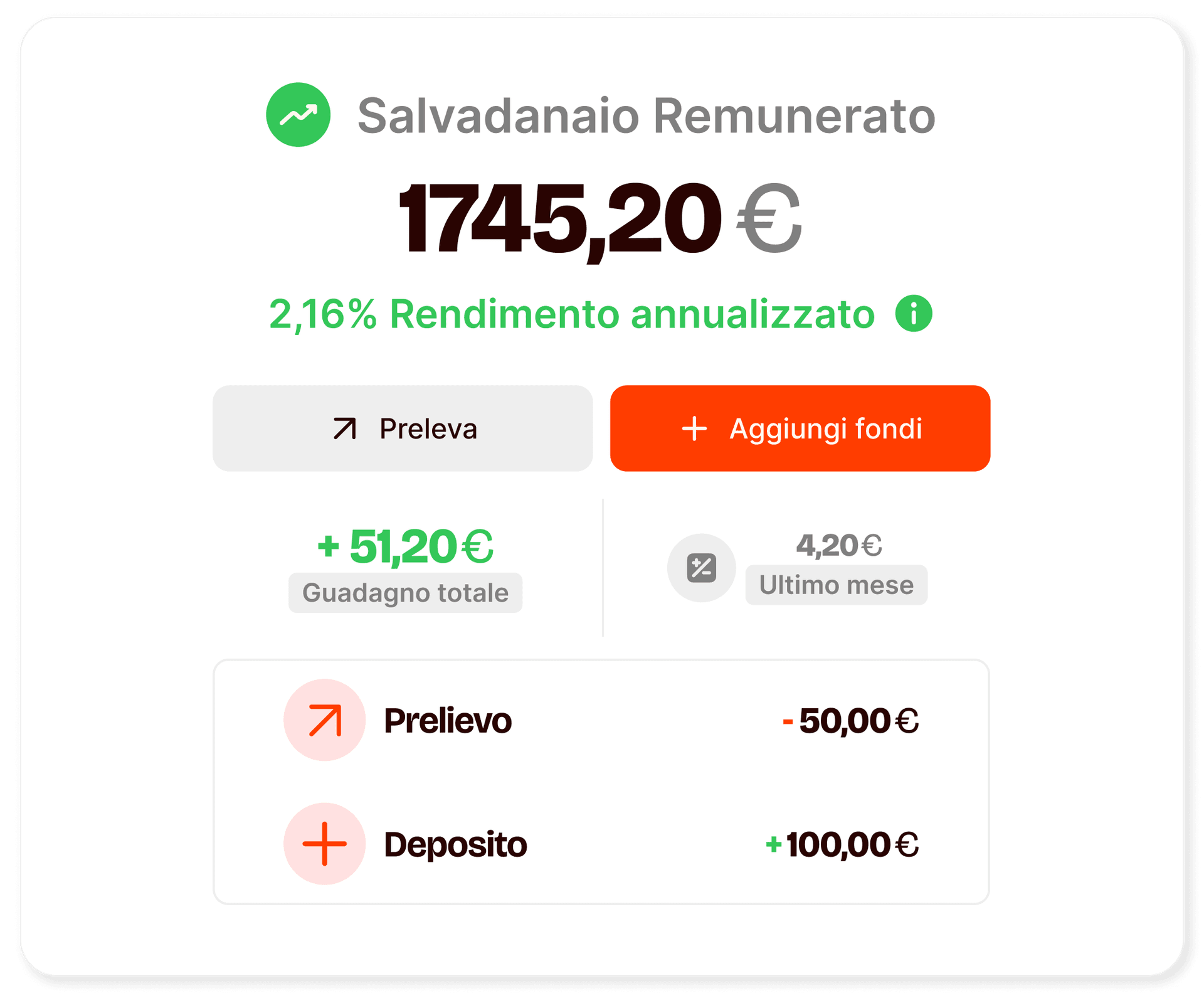 Con Salvadanaio Remunerato investi in un fondo monetario con un rendimento annualizzato attualmente stimato al 2,18%¹ e i tuoi investimenti sono aggiornati ogni giorno.