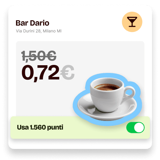 Dalla colazione al bar, allo shopping online, dalle ricariche telefoniche, alle Gift Card, fino alle bollette. Sì, proprio tutto! Per ogni € speso, accumulerai un punto.